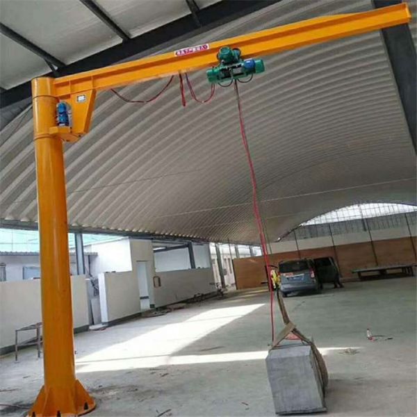 360 degree rotation floor mounted jib crane work for light intensity, crane by post, rotating arm rotation drive device and electric hoist, column bottom through on the concrete foundation with anchor bolt, cantilever rotary driven by cycloidal pinwheel reducer, electric hoist on the cantilever beams as a straight line running from left to right, and lifting heavy objects. Jib crane for hollow steel structure, light weight, big span, lifting weight, economy and durable.